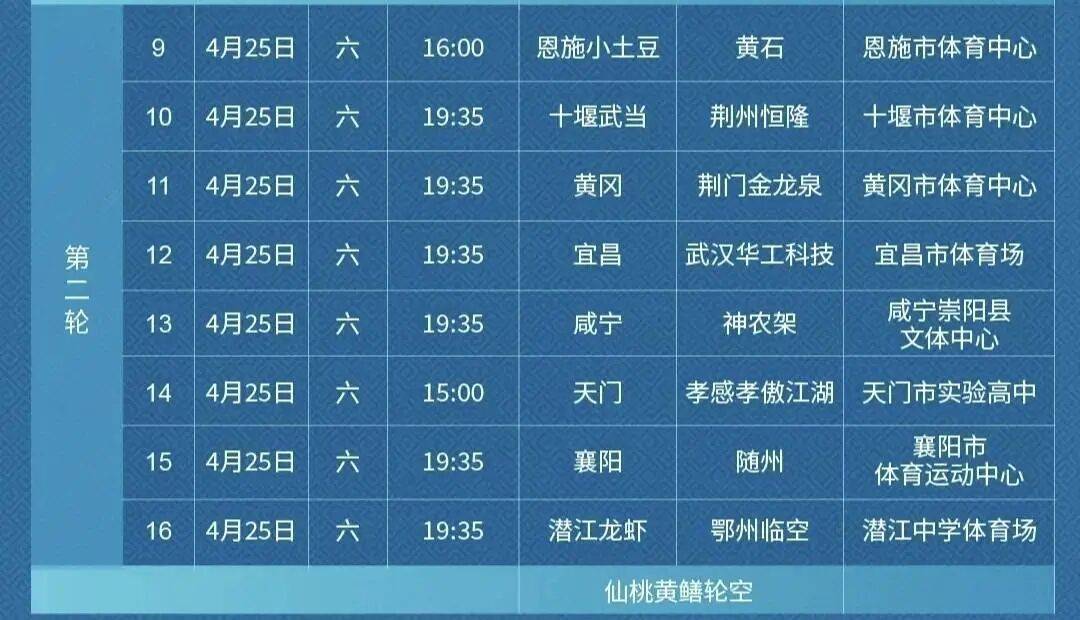 第二轮赛程表。(来源:湖北省城市足球联赛)